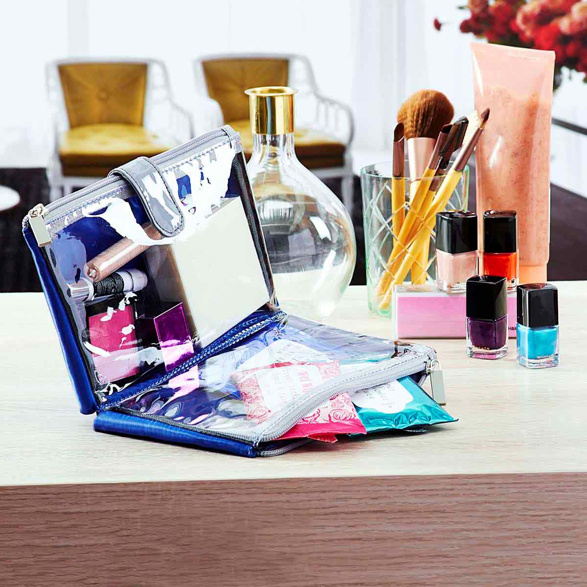 Cosmetiquera con 2 compartimentos internos. Material: poliéster. Medidas: 20 x 14 x 3 cm.