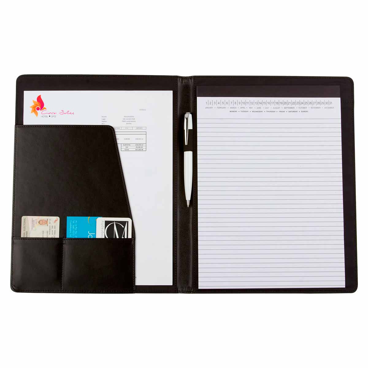 Incluye block de raya tamaño A4 con 20 hojas, elástico para bolígrafo y compartimento para tarjetas. No incluye bolígrafo.