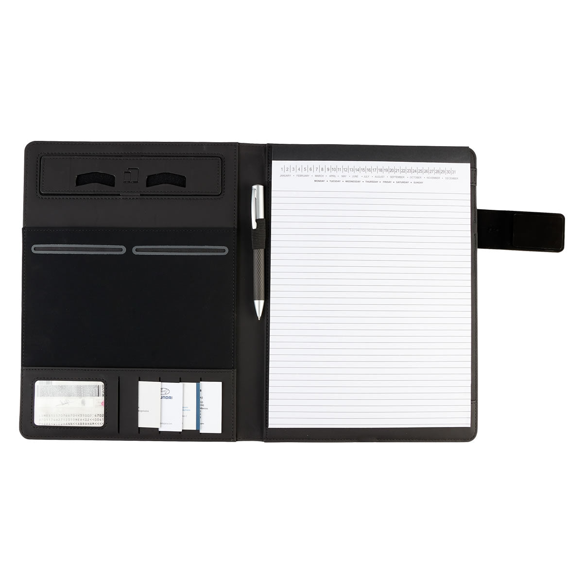 Incluye block de raya tamaño A4 con 20 hojas, elástico para bolígrafo, compartimento para smartphone, tablet y tarjetas. No incluye bolígrafo. Batería auxiliar para smartphone con capacidad 4000 mAh. Broche magnético con luz.