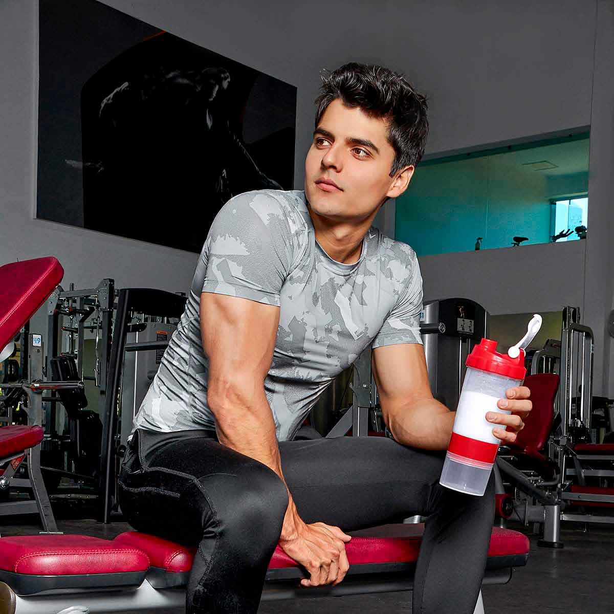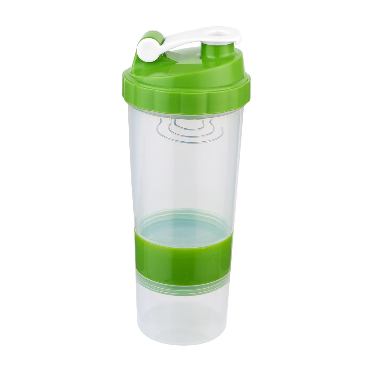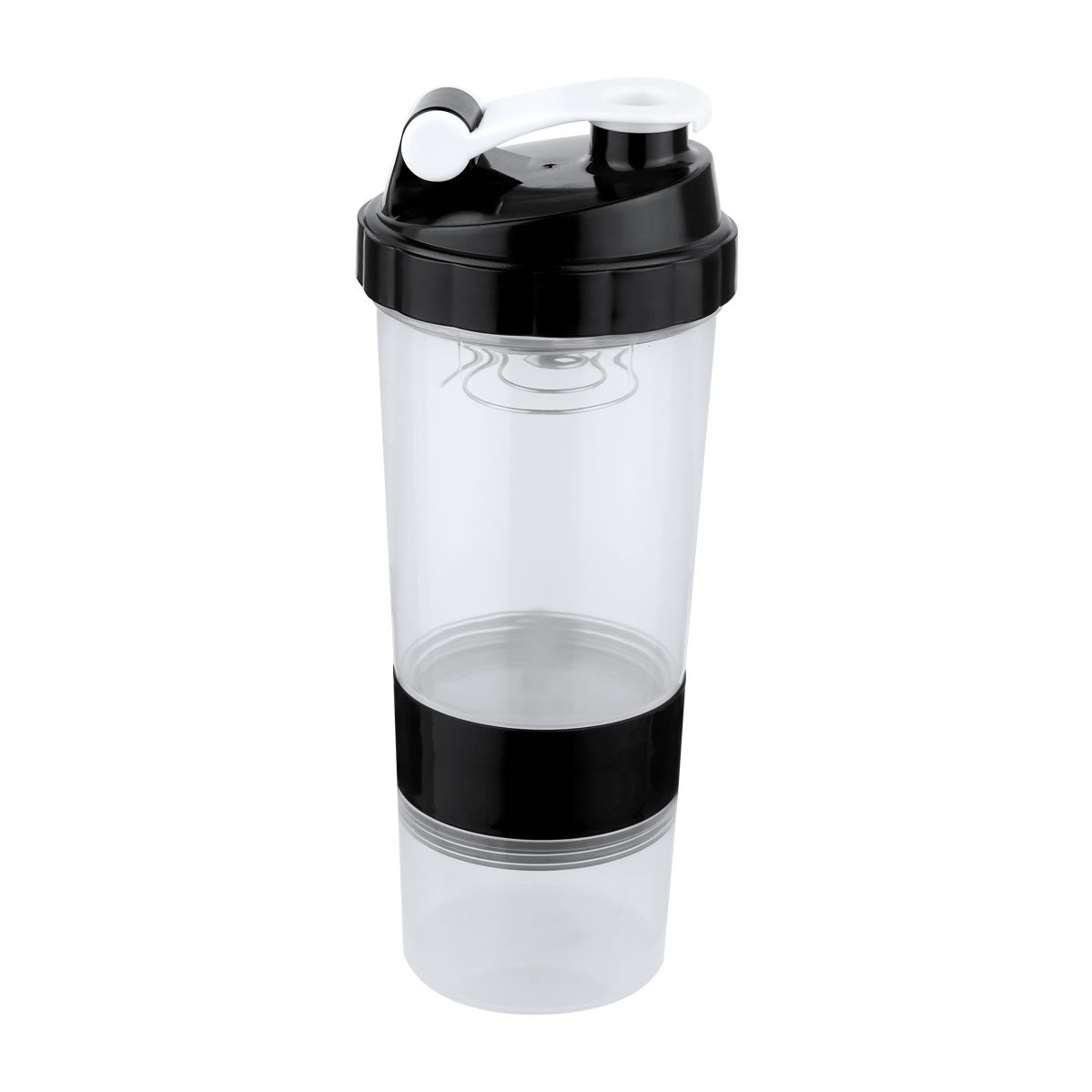 Cilindro shaker de plástico con agitador. Cuenta con dos compartimentos especiales en la parte inferior y divisor de pastillas. Material: plástico. Capacidad de 500 ml.