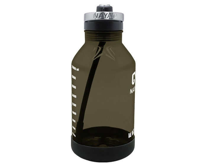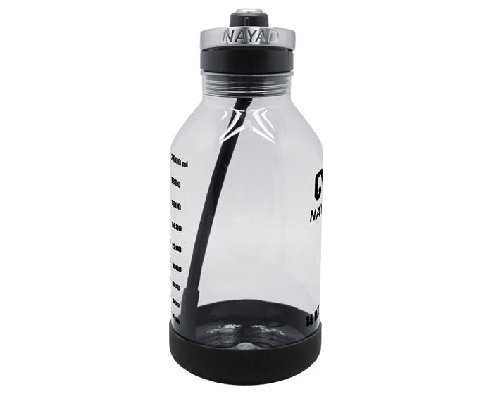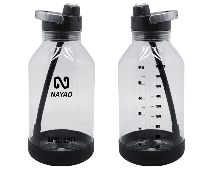 Cilindro NAYAD tipo botella de gran capacidad, con popote de plástico, hecho de Tritan, libre de BPA, con indicadores de medida en Onzas y mililitros de un lado. Del otro lado tiene el logo de NAYAD con la indicación de la capacidad del cilindro; su base tiene una funda de goma anti derrapante, para mayor protección. Cuenta con tapa de rosca modelo TRAVELER con boquilla superior de rosca y asa metálica de acero inoxidable para mayor durabilidad. CAP. 2.5 Lts. (84 Oz). Presentación: Bolsa de non woven.