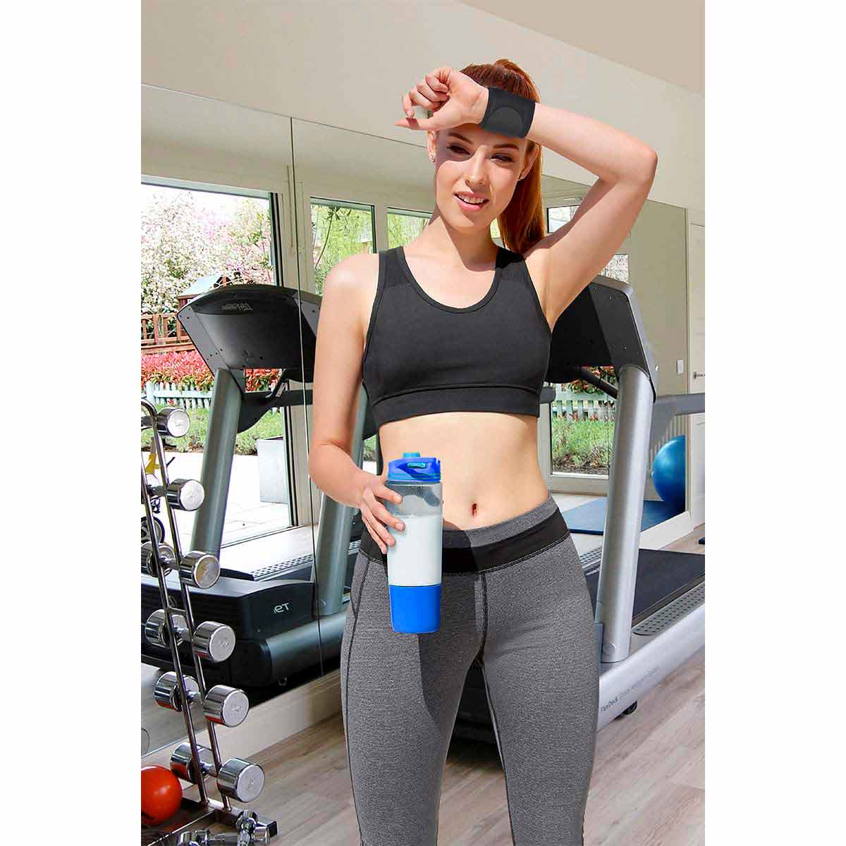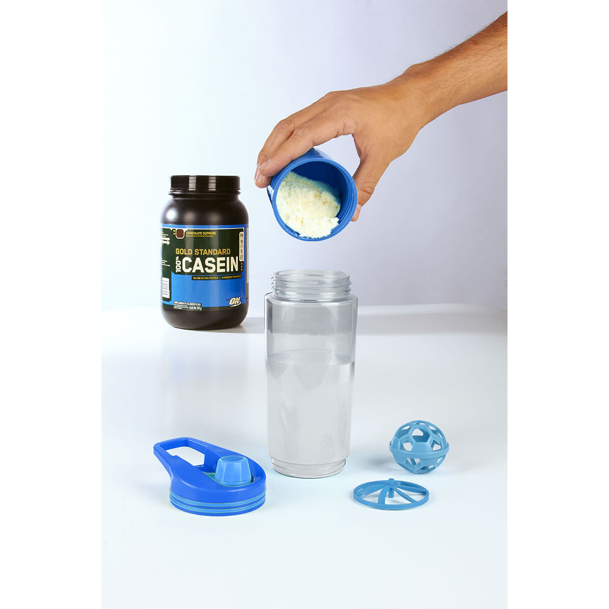 Cilindro de plástico. Incluye agitador. Cuenta con compartimento especial en la parte inferior y agarradera. Capacidad de 625 ml.