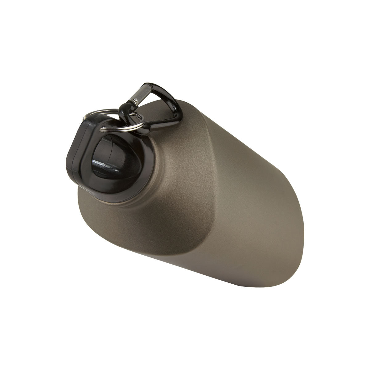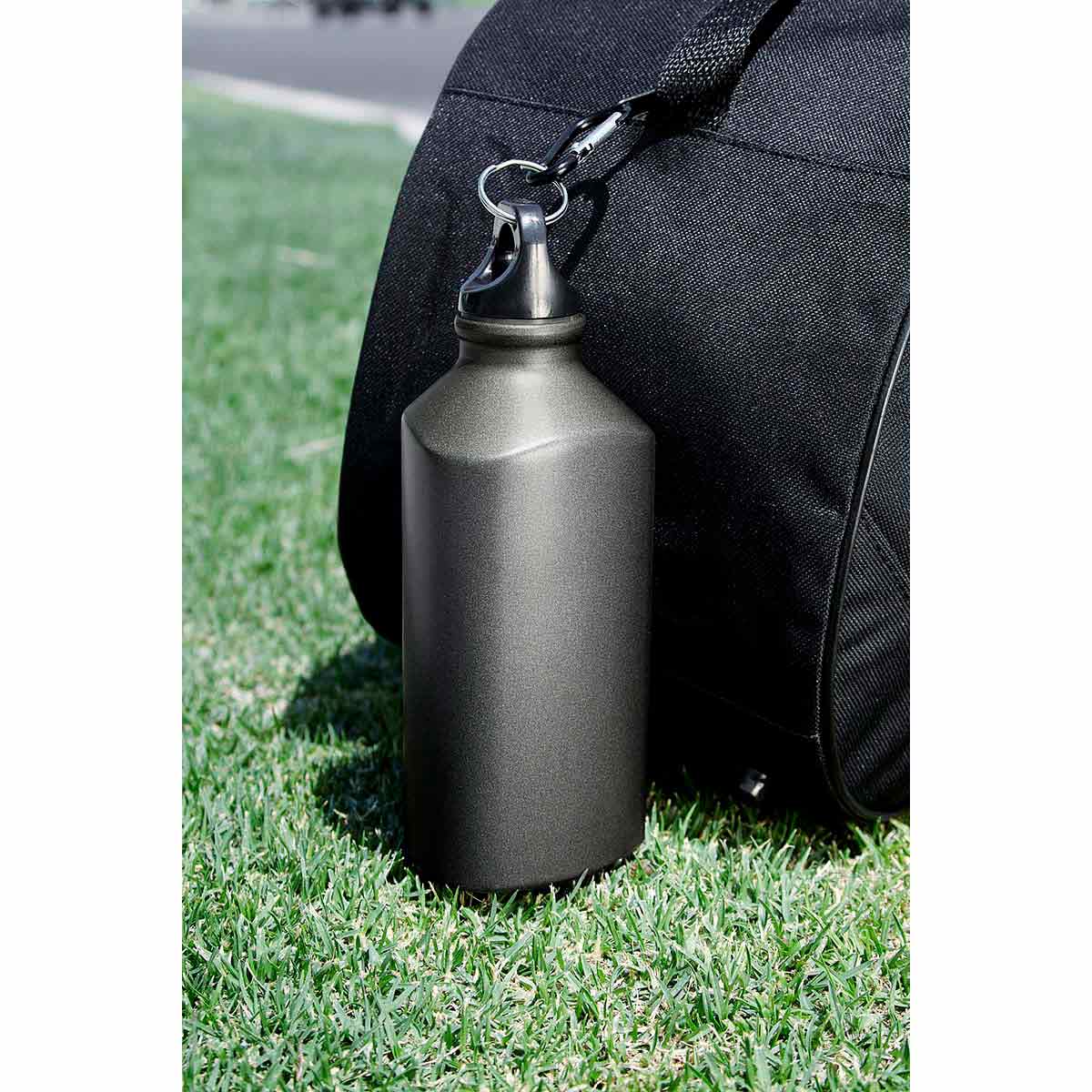 Cilindro metálico triangular. Incluye gancho. Material: aluminio. Capacidad de 500 ml. Color gris metálico
