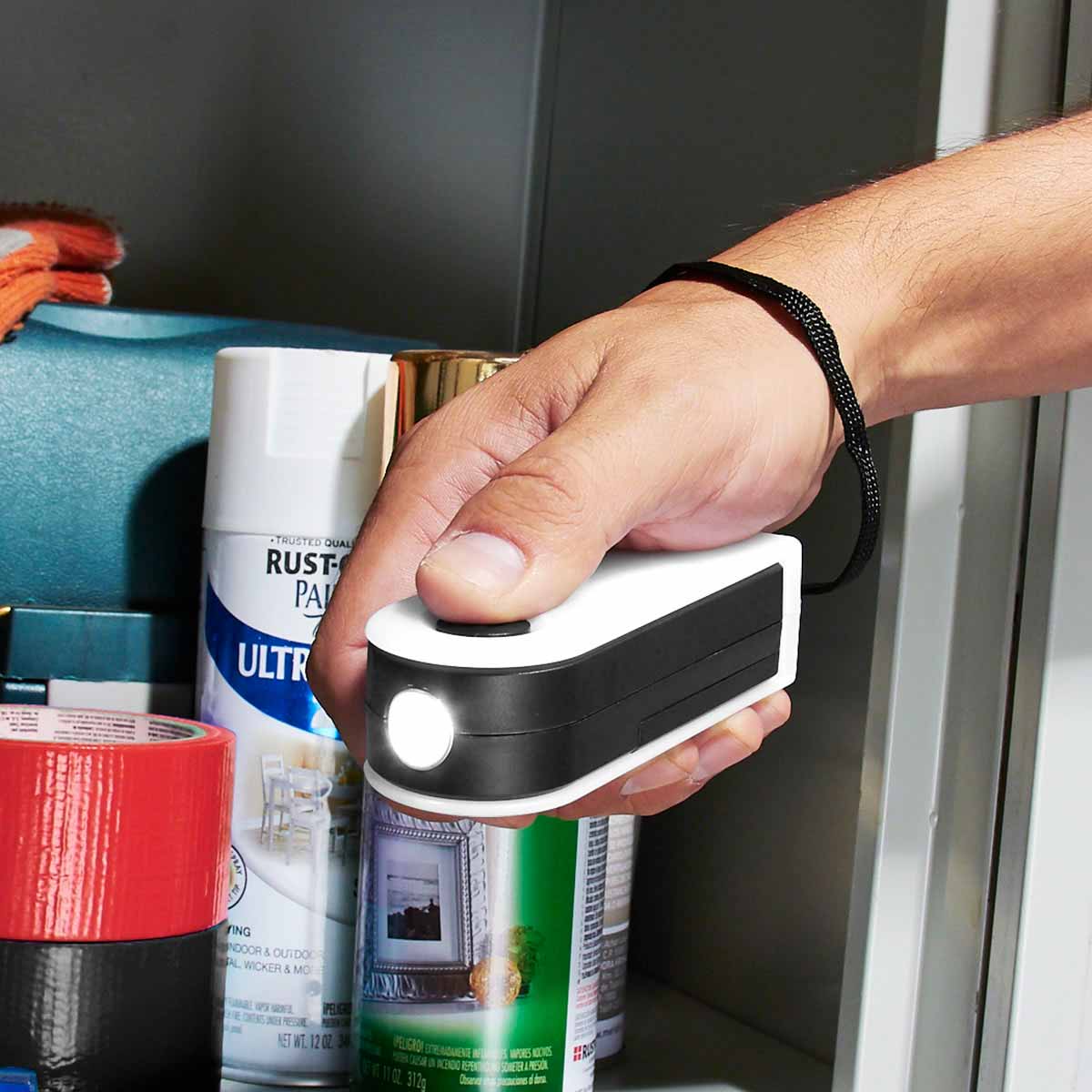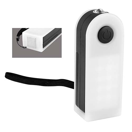 Lámpara con 16 LEDS con cubierta giratoria y correa de mano. Imán en la parte posterior. No incluye baterías (3 pilas AAA). Material: plástico. Medidas: 4 x 10.5 x 3 cm. Color blanco