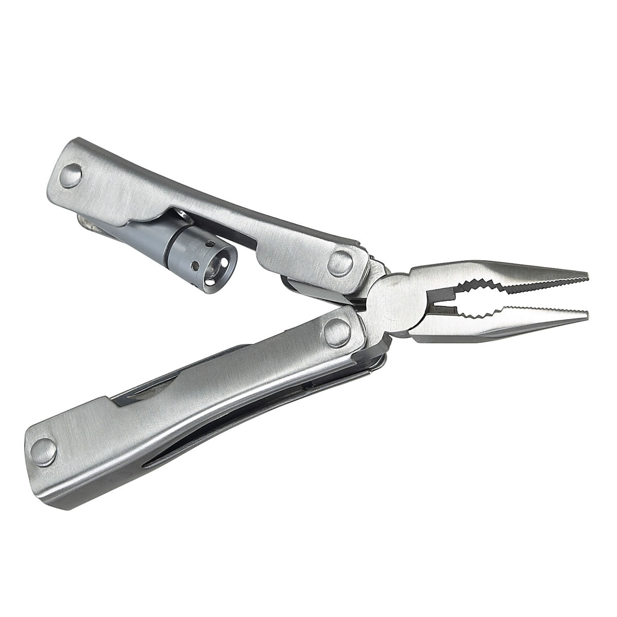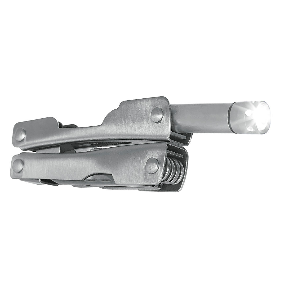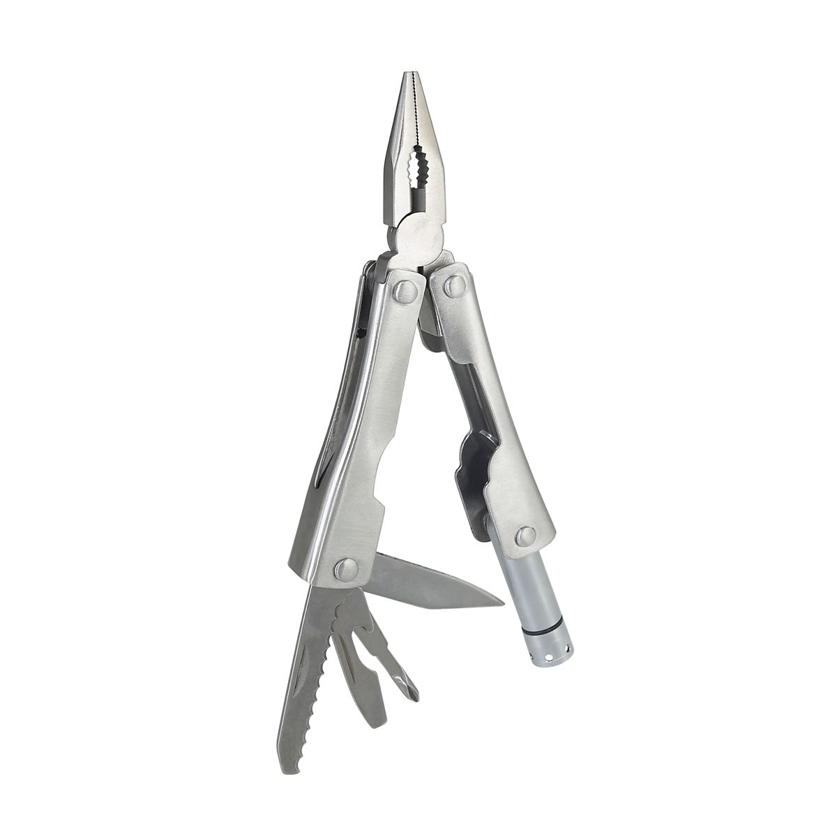 Mini pinzas de 7 funciones, cuenta con lámpara de 1 LED, navaja, desarmador de cruz, serrucho, destapador con punta de desarmador plano. Incluye funda y 3 baterías de botón.