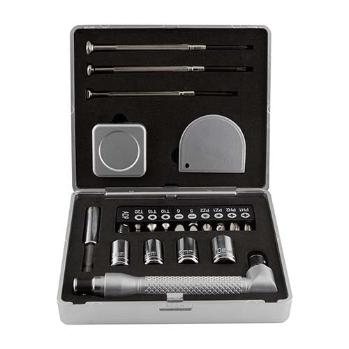 Contiene 3 desarmadores de mano, flexómetro de 1 mt, cúter, 10 puntas de desarmadores diferentes, dados y extensión. Incluye estuche. Material: metal / plástico. Medidas: 11.7 x 10 cm. Color plata