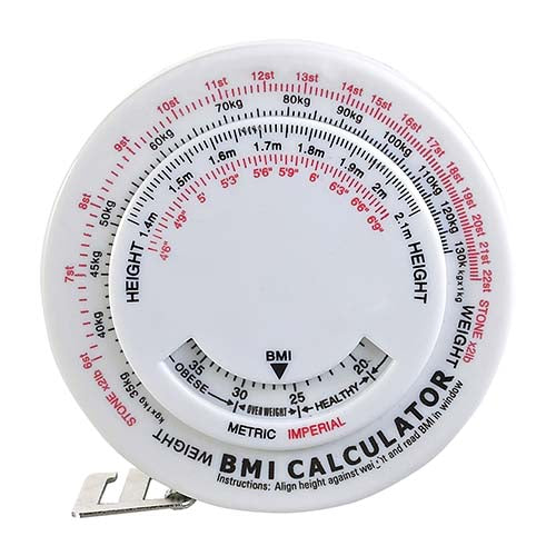 Cinta medidora de masa corporal. 150 cm de longitud. Material: plástico. Medidas: 7.2 cm. diám. Color blanco