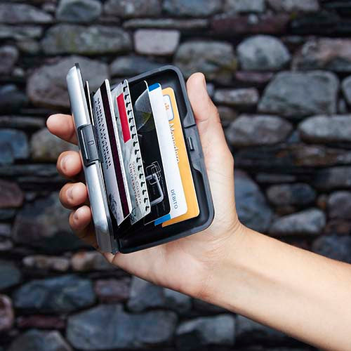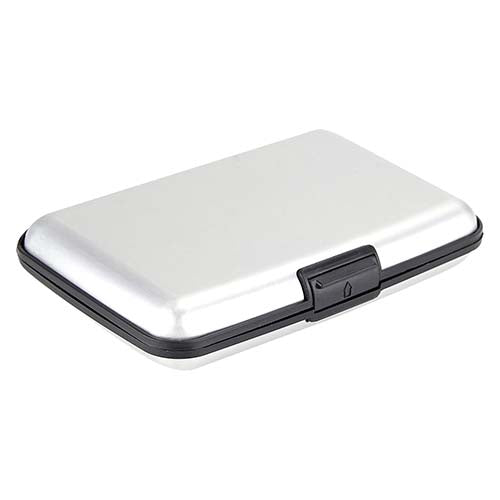 Con 6 espacios para tarjetas. Sistema anti robo RFID. Material: plástico / aluminio. Medidas: 10.5 x 7 cm. Color plata