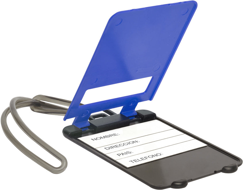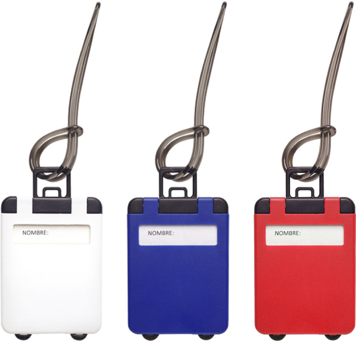 Identificador de maletas. Cuenta con etiqueta para poner nombre, lazo de plástico para colgar en la manija del equipaje. Medidas: 5.4 x 9 cm. Material: plástico.