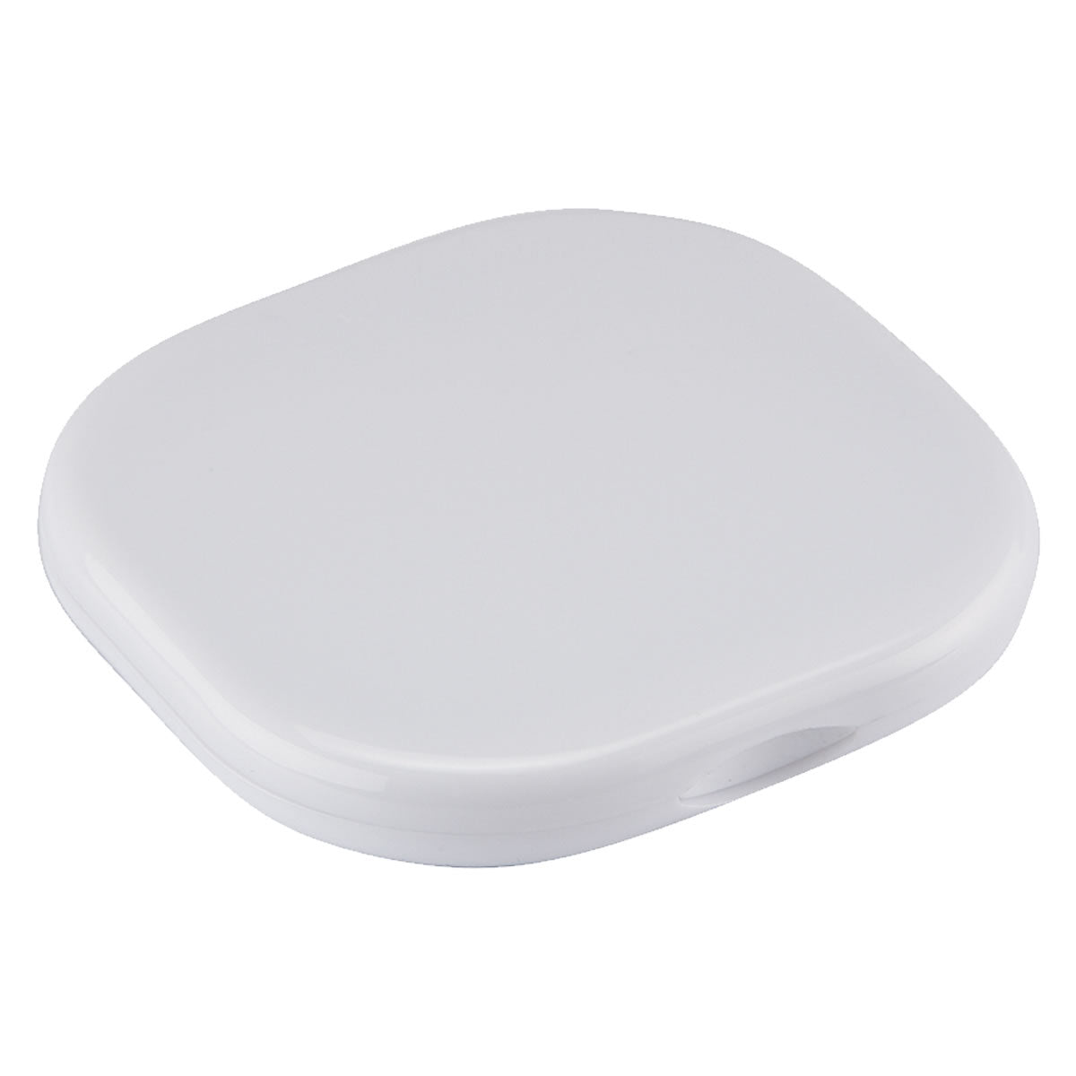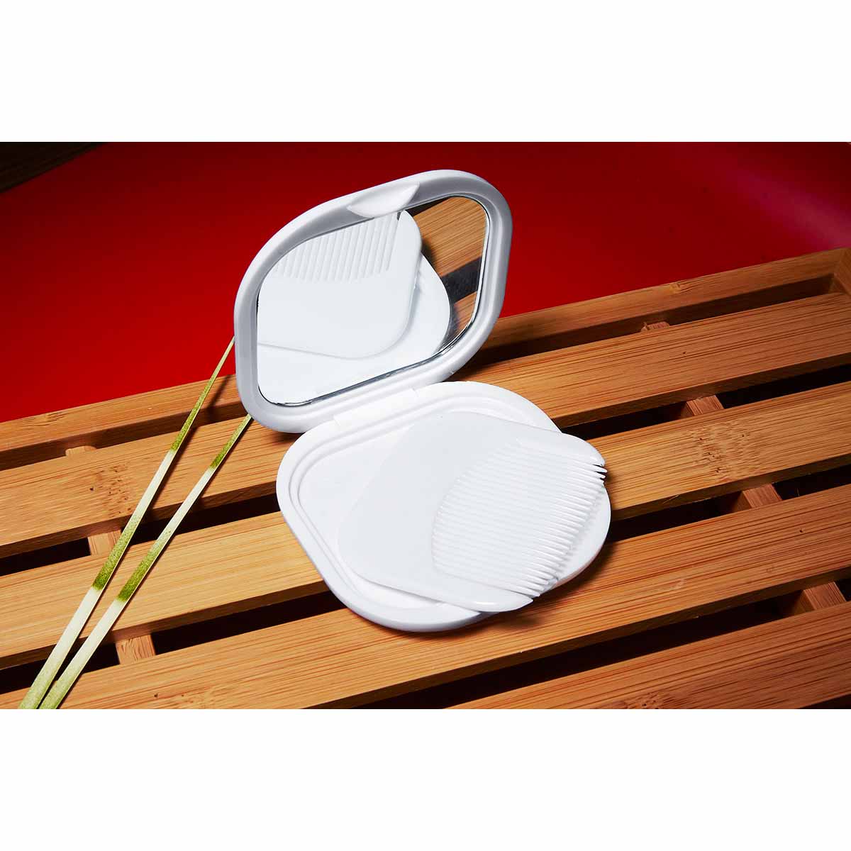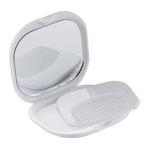 Espejo de plástico. Incluye peine. Medidas: 7 x 7 cm. Color blanco