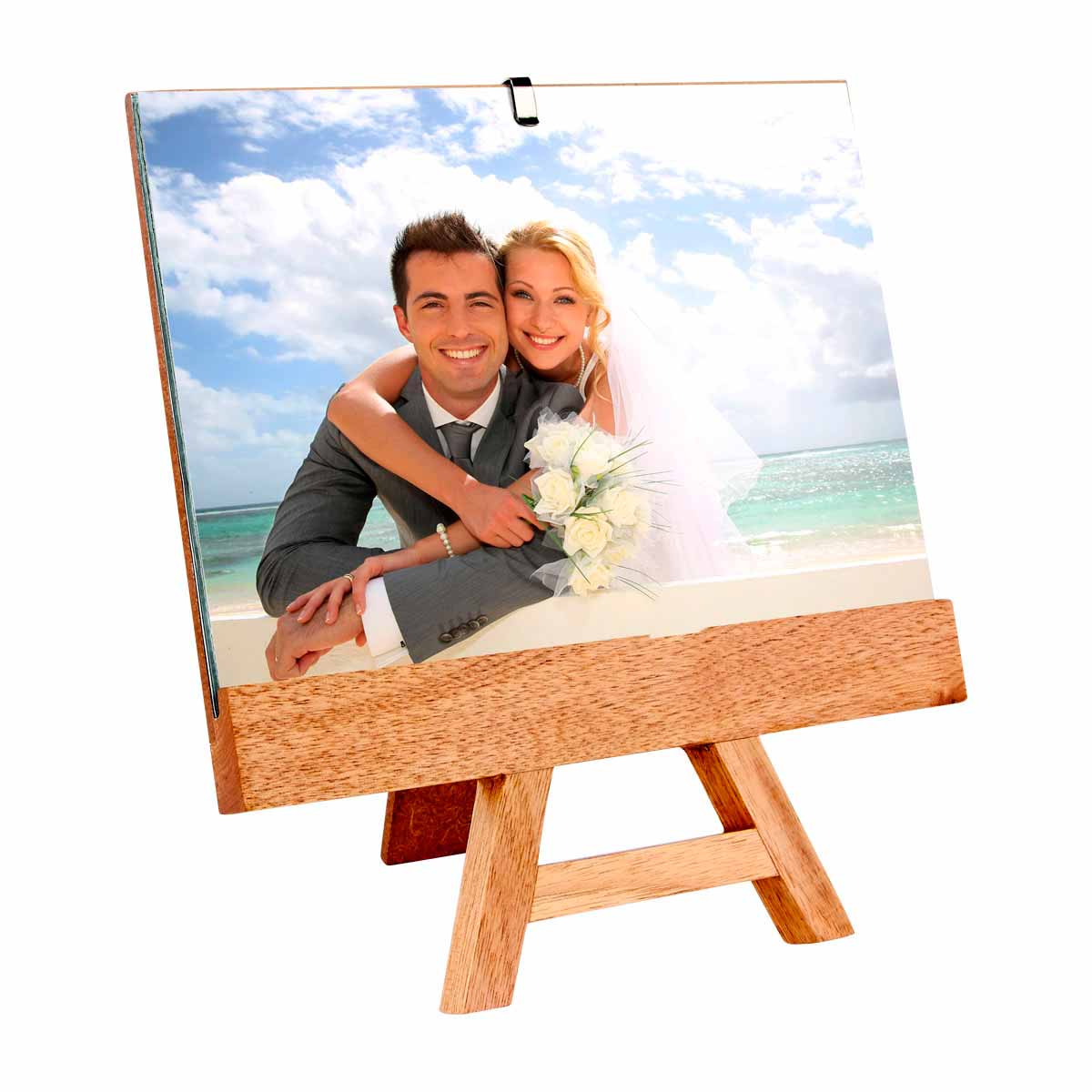 Portarretrato de madera. Tamaño de la foto 18 x 12.5 cm.) Medidas: 18 x 20 cm. Color café